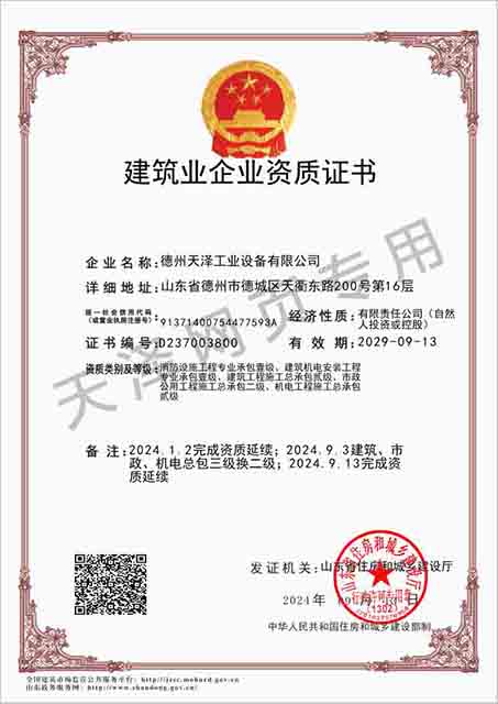 德州天澤工業(yè)設(shè)備有限公司成立于2003年(前身為德州天元集團(tuán)天明工業(yè)設(shè)備安裝公司),經(jīng)過20多年的發(fā)展,現(xiàn)成長為擁有職工600余人,各類專業(yè)技術(shù)人員近300余人,年生產(chǎn)能力兩億元以上,以建筑機(jī)電安裝工程、消防設(shè)施安裝工程施工為主,集建筑工程施工、市政工程施工、建筑智能化工程施工、園林綠化工程施工、工程管理服務(wù)、物業(yè)管理、電氣機(jī)械設(shè)備銷售等多元化經(jīng)營于一體的綜合型企業(yè)。2005年,企業(yè)按照國際標(biāo)準(zhǔn)建立的質(zhì)量管理體系,通過了ISO質(zhì)量管理體系認(rèn)證、環(huán)境管理體系認(rèn)證、職業(yè)健康安全管理體系認(rèn)證。施工工程遍布山東、河北、四川、江蘇等地,最具代表性的工程有:山東省德州市百腦匯資訊廣場機(jī)電安裝工程、德州經(jīng)濟(jì)開發(fā)區(qū)天元大廈機(jī)電安裝工程、陵城區(qū)人民醫(yī)院機(jī)電安裝工程、德州金魯班大廈機(jī)電安裝工程、河北故城金辰小區(qū)機(jī)電安裝工程、北川地震災(zāi)后援建工程等。多年來,公司始終堅(jiān)持“以人為本,建精品工程,創(chuàng)行業(yè)品牌”的經(jīng)營理念,先后榮獲省(市)級泰山杯、天府杯、魯安杯等獎(jiǎng)項(xiàng),申報(bào)各種功法、多項(xiàng)專利。